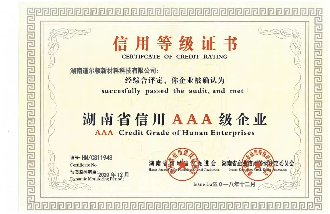 熱烈祝賀道爾頓被評為湖南省信用AAA級企業!